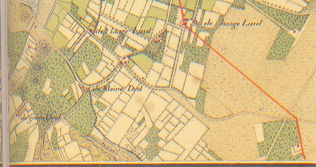 Een klein stukje over de grond waar blokhut de Wildert opstaat. Ik vermoed, en ’t is vrij moeilijk uit te rekenen, dat het dan gaat om het perceel E160, hakhout, eigendom van P.J. Cuypers. Een groot deel van dat grote perceel en mastbos E161 is later gebruikt voor ’t aanleggen van de leidingstraat. Belangrijker is de beukenlaan die langs de blokhut het bos in loopt, tot aan ‘de Dikke Boom’.