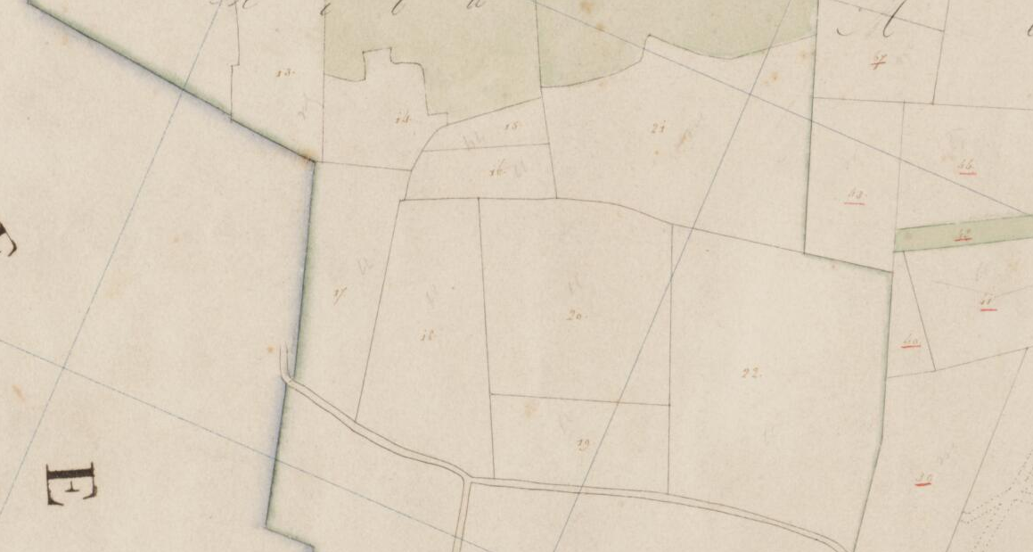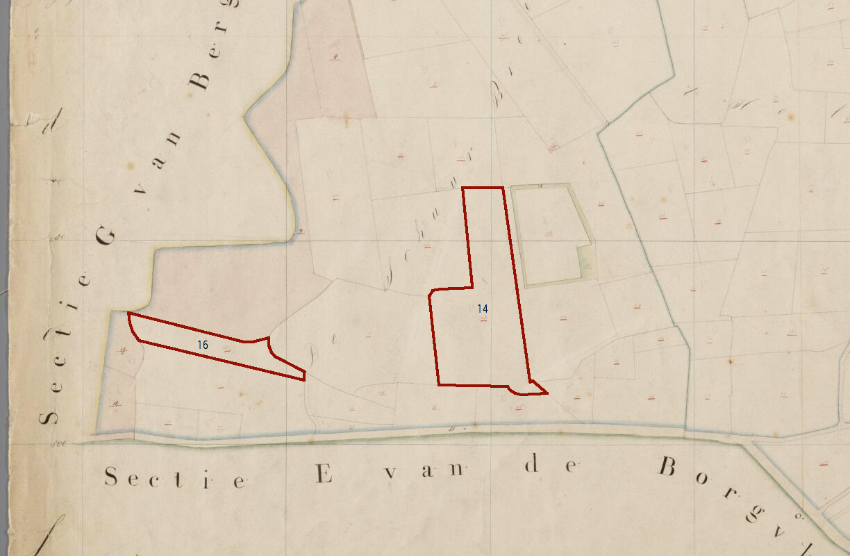 Het onderzochte gebied, verwerkt op de kadasterkaart 1811-1832. De weg onderaan is de Huijbergsebaan (onder de Huijbergsebaan sectie F, Oud-Borgvliet, en de gemeente Woensdrecht), de weg rechts (toen nog min of meer een kronkelpad) is de Molenzichtweg. De leidingstraat, belangrijk ijkpunt in de vergelijking van deze kaart met die van 2016 hierboven, loopt vanaf perceel E161 naar boven, parallel langs de weg, in ieder geval tussen percelen E150 en E159 door. (Originele afbeelding: Rijksdienst voor Cultureel Erfgoed)