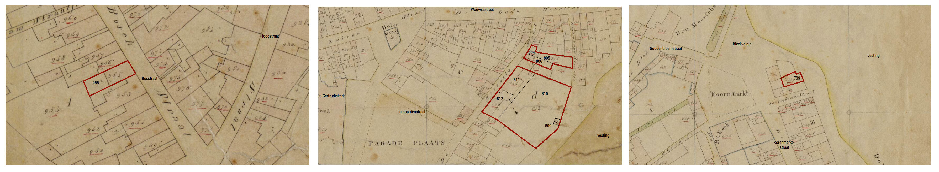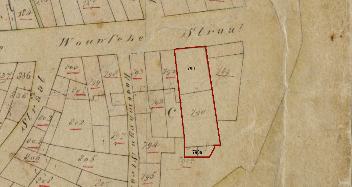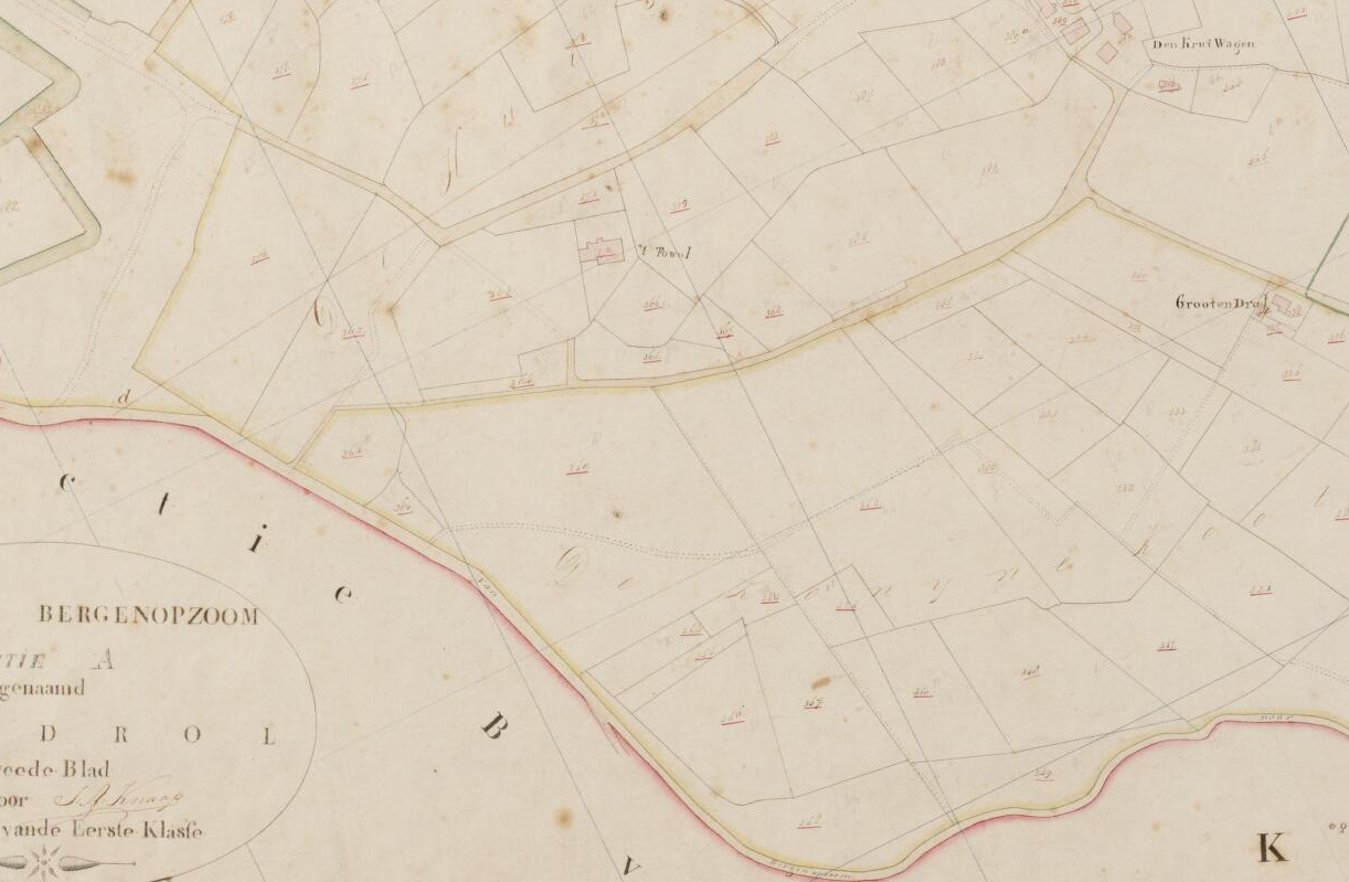 Als laatste wil ik kijken naar ’t stukje bos tussen Malotaux’ grond en de Huijbergsebaan. Op de kadasterkaart zijn vier rechthoekige percelen te zien, die zelfs op de satellietfoto hierboven nog best te herkennen zijn (binnen de donkerrode lijn). De percelen waren E137, E138, E140 en E141, de twee linkse hakhout, de twee rechtse mastbos. Ze waren eigendom van de erfgenamen van Johan Gijsbertus (Jan) Drabbe (*Bergen op Zoom, 2/8-1741, ✞ 1795), afkomstig uit een stokoude Bergse familie van politici en predikanten (zie ook de Drabbestraat op ’t Bolwerk). Wie kunnen we verstaan onder zijn erfgenamen? Onder andere zijn weduwe Johanna Lamberdina Scherpingh (✞ Bergen op Zoom, 9 juli 1831), en zijn kinderen Wilhelmina Frederika Antoinette Drabbe (*Wouw, West-Brabant, gedoopt te Bergen op Zoom, 3/9-1786, ✞ Bergen op Zoom, 8/5-1828) en Johan (Jean) Drabbe (*Bergen op Zoom, 3/12-1777, ✞ aldaar, 27/6-1835). Laatstgenoemde is degene die als “adjoint maire délégué”, oftewel ‘hulpburgemeester’, zijn handtekening zette onder de overlijdensakte van de zoon van burgemeester Vermeulen die ik eerder in dit artikel beschreef. Deze functie komt ook voor in de geboorteakte van zijn zoon Jean Drabbe uit 1814: “maire adjoint de la ville de Berg-op-Zoom”. Nog belangrijker is de geboorteakte van zijn dochter Lucie Antoinette Drabbe uit 1811.