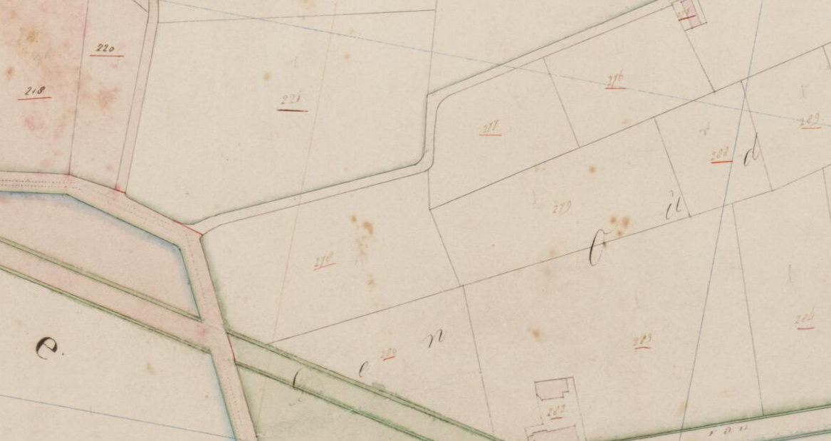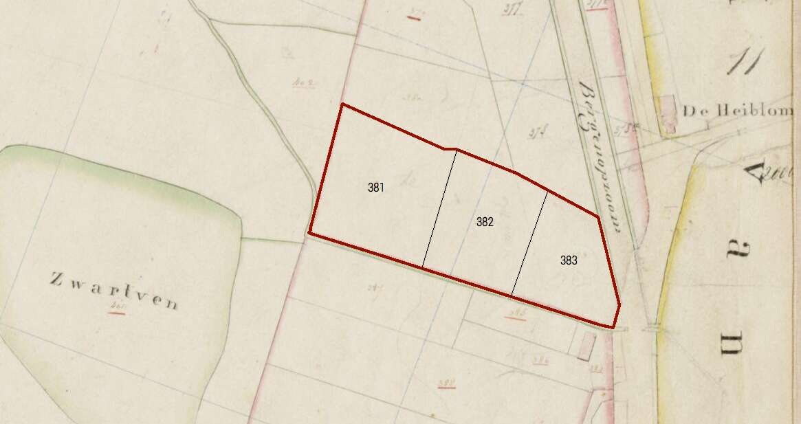 Aan de overkant van de leidingstraat liggen de ‘Vier Veldjes’ (waar er nu nog drie van over zijn), stukjes grond omringd door uit de kluiten gegroeide wilgenhagen. Hier komen wel ‘ns hobby-archeologen met hun metaaldetectoren, en volgens hen liep er vroeger een doorgaande weg richting Wouw langs de veldjes. Op de kadasterkaart is die weg wel te zien, maar lijkt ze te stoppen ter hoogte van perceel E155. Dat er ooit bebouwing was bij deze veldjes is waarschijnlijk, en ook te zien op de kaart: E150 en E151, huis en erf. Om deze bebouwing lagen verschillende stukjes dennebos, ‘schaarbosch’ en zelfs een ‘pleiziertuin’, wat een aanwijzing kan zijn dat de familie die eigenaar was zelf op de grond woonde.