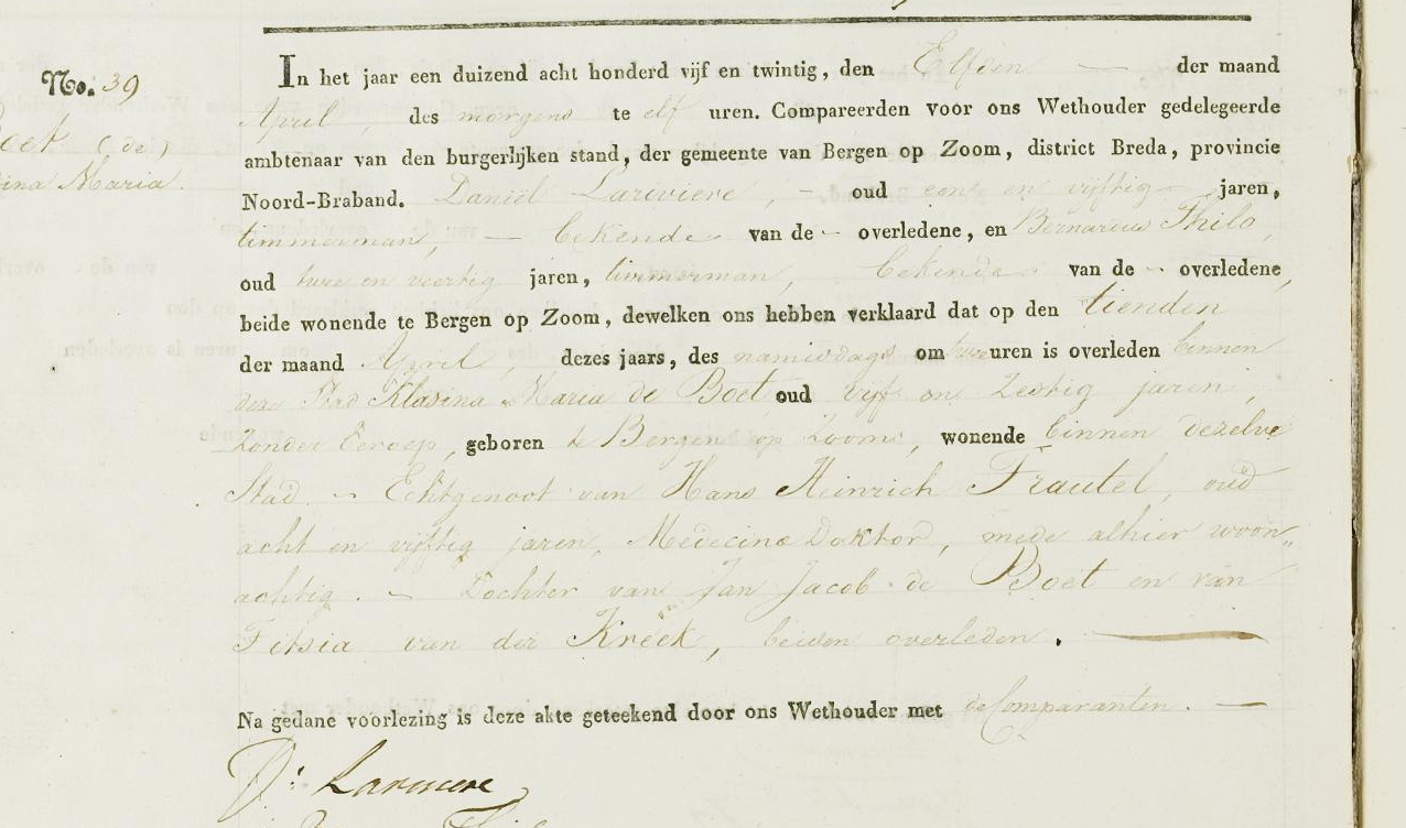 “Du dixième jour du mois de Mars l’an dix huit cent quatorze à dix heures du matin, Acte de décède de Pierre François Vermeulen, célibataire, Directeur du Mont de pieté, décéde le huit de ce mois à onze heures du soir, âgé de Vingt quatre ans, neuf mois sept jours, né et domicilié à Berg-op-Zoom, Département des Deux-Nèthes, y demeurant Section trois numéro Vingt neuf, fils de Gerard Vermeulen, Maire de la ville de Berg op Zoom, Chevalier d’ordre Impérial de la réunion; et de Marie Thérèse Van Pelt, conjoints domicilié en cette ville. Sur la déclaration de Michel Pierre Smets, âgé de Vingt deux ans, Chef de Bureau à la mairie, demeurant section prémière numéro quatre vingt quinze; et de Jean Court, âgé de trente quatre ans, Menuisier, demeurant section prémière numéro quatre, qui ont signé avec nous. Constaté par moi, Jean Drabbe, adjoint maire délégué, Officier de l’etat-civil, soussigné, duquel acte il a été donné lecture.”