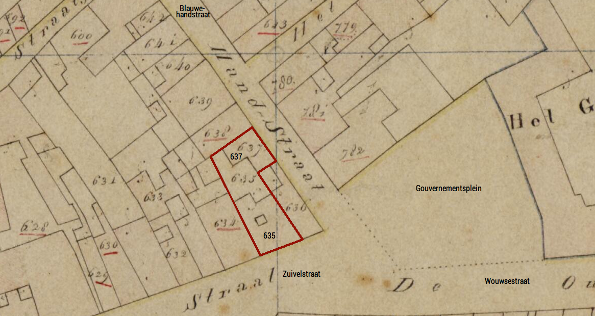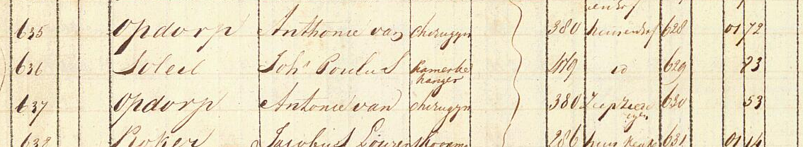 Vader Gerardus Vermeulen was in 1814 dus burgemeester van Bergen op Zoom geworden, en daarnaast ook nog ridder in de ‘Keizerlijke Orde van de Reünie‘. Het was tenslotte de tijd van Napoleon; zie ook de verwijzing naar het département van de Twee Neten waarin Bergen op Zoom met Antwerpen, Breda en Mechelen één Frans departement vormde. Deze Gerard Vermeulen komt inderdaad ook voor op de lijst van burgemeesters van Berrege en is één van de drie burgemeesters die grond bezaten in het kleine stukje bos wat ik onderzocht heb (onthoud ook even de naam van Jean Drabbe, ondertekenaar van de overlijdensakte). Het kadaster vermeld over percelen E193 (schuur), E194 (heide) en E195 (windgraanmolen plus erf), dat de eigenaresse, de weduwe Gerardus Vermeulen, woonachtig was te Antwerpen (zie onderstaande afbeelding). Die connectie vond ik in zijn overlijdensakte, opgemaakt in ’t Stad in 1823, toen nog deel van het Verenigd Koninkrijk der Nederlanden.