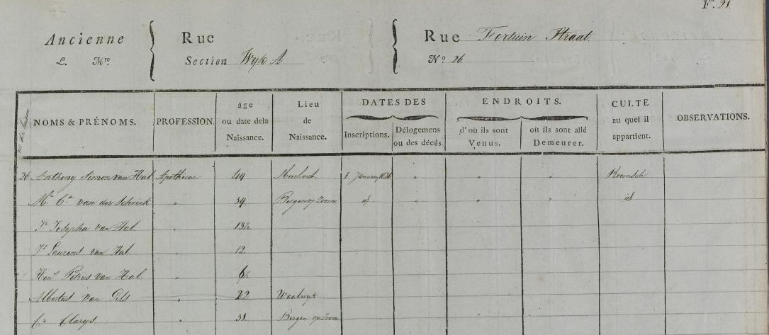De huisjes van de Heimolen zal ik behandelen als ik Woensdrecht ga doornemen, maar de Heimolen zelf heb ik al in de Bergse sectie E gevonden. Ze was eigendom van de weduwe van ene Gerardus Vermeulen, woonachtig te Antwerpen. Achterhalen om welk echtpaar ’t hier ging was niet makkelijk, maar ’t blijkt te gaan om de burgemeester van Berrege tijdens Napoleon, en diens familie. Een Gerardus Vermeulen komt in 1792 al voor in een akte van notaris Benjamin van der Hagen te Bergen op Zoom, hij is dan “griffier van het Huis van Bergen op Zoom”. In 1797 en 1798 laat hij RK te Bergen op Zoom dochter Juliana Theodora Vermeulen en zoon Ludovicus Maximilianus Vermeulen dopen. Zijn vrouw is dan Maria Theresia van Pelt, vermeld werd dat hij uit Oudenbosch kwam en zij uit Turnhout. In 1814 overlijd hun zoon Pierre François Vermeulen; die akte geeft wat meer informatie.
