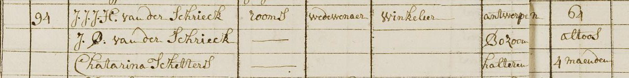Ten tweede de straatnamen: in de Napoleontische tijd werd ‘Hoogstraat’ vertaald als “rue haute”, maar voor Rijkebuurtstraat wisten ze niks te verzinnen, en dat werd dus opgeschreven als “rue dite rykebuurtstraat”. Dan nog de familie Vermeulen. In 1814 ondertekend Drabbe dus de overlijdensakte van Pierre François Vermeulen, bij deze akte is het diezelfde Pierre François die getuige mag zijn bij de geboorte van zijn dochter. Hij is dan betrokken bij een “hospice”, iets van een (militair) ziekenhuis. Dat Gerard Vermeulen als burgemeester zijn handtekening zette is procedure, maar de band tussen de twee families ging dus verder dan dat.
