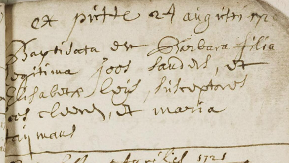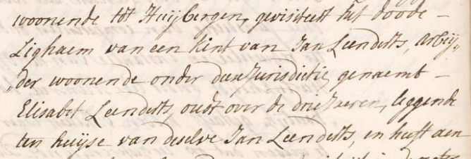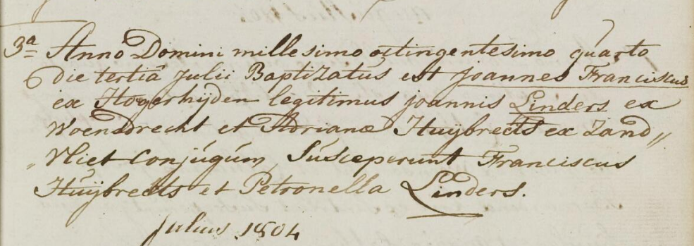 Jan Linders had met Barbarina drie kinderen: Maria Linders (*1743, LW13), Elisabeth Linders (*1745, LW14) en Leonardus Linders (*1747, LW15), allen gedoopt te Woensdrecht (dat wil zeggen in de schuurkerk te Hoogerheide). In de gerechtelijke archieven van Woensdrecht vond ik een akte uit januari 1749. De Huijbergse chirurgijn Balthazar Johannes Frits verklaarde aan de schepenen van Woensdrecht, Gerrit van Putte en Maghiel Verreesen, dat hij langs Jan Linders was geweest. “Gevisiteerd het doode lighaem van een kint van Jan Leenderts, arbeijder, woonende onder deese jurisdictie, genaemt Elisabet Leenderts oudt over de drie jaeren.”