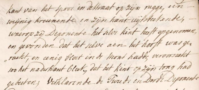 Lucia rende naar buiten, achter de twee meisjes aan die het huis van Jan Linders binnenrenden. Toen zag ze Elisabet liggen, in de “kant van het spoor van de weg” op haar rug. Ze stak haar hand uit en kreunde zachtjes. “Waerop zij deponente het selve kint heeft opgenomen en gevonden dat het selve aen het hooft was geraekt, en eenig bloet in de mont hadde, veroorsaekt soo het naderhant bleek, dat het kint op zijn tong had gebeeten”. Catarina en Barbel kwamen ook af op het geluid, en vonden Elisabet in de armen van Lucia. De verklaring moest volgens de getuigen zijn dat het hollend paard Elisabet geraakt of getrapt had. Het kindje werd naar binnen gebracht en overleed daar rond tien uur ’s avonds. Het paard kwam niet uit het niets; de getuigen verklaarden dat zij van horen zeggen hadden dat die middag een paard van Nicolaes van Pageé op hol geslagen was, en had gelopen vanaf het huis ‘de Swaen’ tot aan de gemeentewerf.