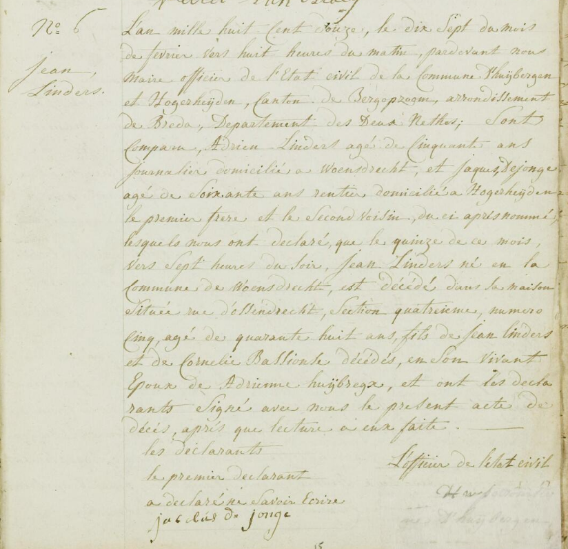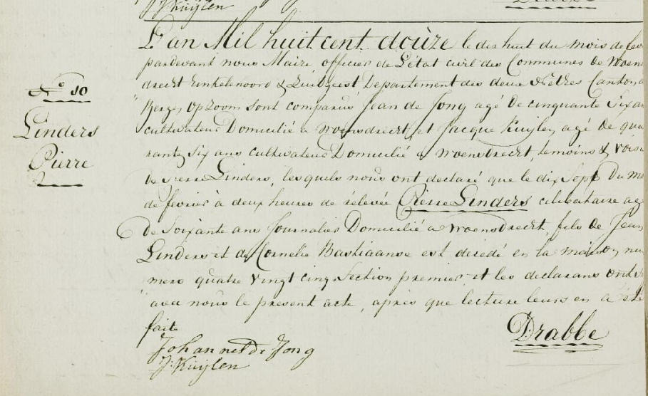LW11. Petrus (Pierre) Linders. Geboren in 1755 te Woensdrecht (West-Brabant).281,2987 Gedoopt op 6 oktober 1755 te Woensdrecht (West-Brabant).281,2987 Overleed op 17 februari 1812 te Woensdrecht (West-Brabant).281,311 Geloof: rooms-katholiek. Hij was dagloner (1812). – Zijn doopgetuigen waren Paulus Nouts (?) en Anna Maria Wesemael. – Hij overleed om twee uur (’s nachts of ’s middags in me niet bekend; citaat: “à deux heures de rélevée”). De aangifte werd gedaan door Johannes (Jean) de Jong, buurman, 56, landbouwer, woonachtig te Woensdrecht en Jacque Kuijlen, buurman, 56, landbouwer, woonachtig te Woensdrecht. Hij overleed bij hemzelf thuis te Woensdrecht, sectie één, nummer 85.2987,311 Update 19/6-2018