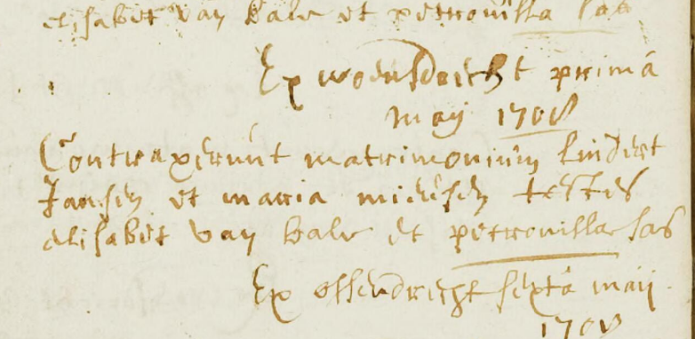 - Een zoontje Leonardus werd op 21/6-1655 RK te Huijbergen gedoopt. Hij was een kind van Joannes Lenaerts en Anna Adriaensens; geboren te Woensdrecht. Getuigen waren Joes. Adriaensen en Maria Lenaerts. Het echtpaar kreeg in ieder geval nog een kind te Woensdrecht; zoontje Adrianus, geboren te Woensdrecht, RK gedoopt op 14/8-1667 te Huijbergen. De ouders werden toen vermeld als Joannes Lenaerds en Anna Adriaenssen; getuigen waren Cornelis Willemsen en Maria Janssens. Een heleboel lijkt hier te kloppen; ’t zou betekenen dat Lindert Jansen Nuts wat ouder was dan geschat, maar dat blijkt later vrij gebruikelijk in de familie. Zo is de doopplaats Woensdrecht, komt de naam van de moeder (Adriaensen) overeen met die van getuigen bij de doop van de kinderen van Lindert Jansen Nuts en kloppen de patroniemen. Wat dan weer niet aansluit is dat ik van ’t echtpaar Joannes Lenaerds x Anna Adriaenssen geen achternaam kon vinden, en dus vooral geen ‘Nuts’ o.i.d. Daarbij is er geen connectie met Essen of Leendert Antonissen Nuijts zoals vermeld in de belangrijke voogdijakte uit 1716 (die akte wordt verderop nog nader omschreven). Een huwelijk zou daar meer duidelijkheid over kunnen geven, echter is deze ook niet te vinden. Het enige wat erop lijkt is een RK-huwelijk te Huijbergen op 10/5-1664 tussen Joes. Hendrixsen uit Woensdrecht en Anna Adriaensen uit Hoogerheide. Getuigen daarbij waren Antonius Verasselt en Petrus de Laet.