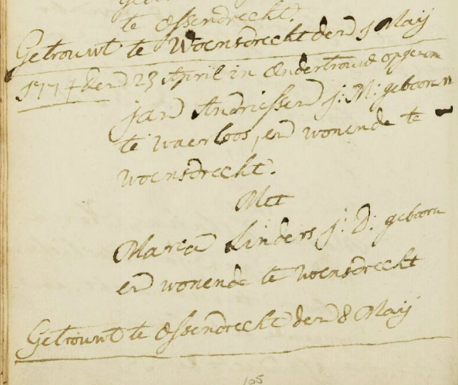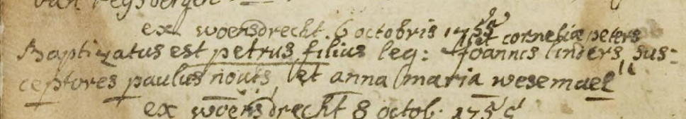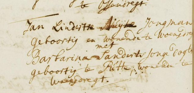LW4. Johannes (Jan) Linders. Geboren op 4 oktober 1711 te Woensdrecht (West-Brabant).2662,2596,2524 Gedoopt op 4 oktober 1711 te Woensdrecht (West-Brabant).281,2662 Overleed in 1779 te Woensdrecht (West-Brabant). Begraven op 30 januari 1779 te Woensdrecht (West-Brabant).281,2991 Geloof: rooms-katholiek, vermeld NH. Ook bekend als/Schrijfwijze ook: Jean, Jan Leenderse, Jan Lindertse, Joannis, Joännus – Lenders, Linders Nuts, Nuijten, Nuijte, Leenderts, Leendertse. Zijn doopgetuige was Joanna Mieussen. – Op 28 mei 1749, vier dagen na zijn ondertrouw, werden Jasper Sanders en de Woensdrechtse schepen Maghiel Verrees aangesteld als voogd over zijn zesjarige dochter Maria. – Vastgelegd werd dat het kind voorzien zou worden van eten, drinken, kleding en zou leren lezen en schrijven, en dat vader Jan haar vijf gulden zou uitkeren wanneer ze achttien werd. Jasper is trouwens een voornaam die ik uit Putte ken van mijn voorouder Jasper Taeymans (KW1758), wiens achternaam weer overeenkomt met Barbarina’s doopgetuige. – Het NH huwelijk in 1749 ging met een ondertrouw op 24 mei 1749 en een huwelijk op 8 juni 1749 te Woensdrecht. Hij werd vermeld als Jan Leenderse Nuijten, weduwnaar van Barbera Sanders, zij als Cornelia Peters, weduwe van Gerard Offermans. – Een Barbel Maghielsen diende in 1749 bij hem als meid. 2662,2596,3009 Update 19/6-2018