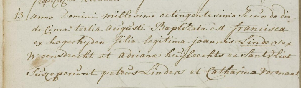 LW10. Leonardus Linders. Geboren in 1752 te Woensdrecht (West-Brabant).281,2987 Gedoopt op 10 april 1752 te Woensdrecht (West-Brabant).281,2987 Geloof: rooms-katholiek. Geen overlijden gevonden, hij overleed wellicht dus vóór 1811. – Zijn doopgetuigen waren Jacobus (.., Janss?) en Adriana Nefs.2987 Update 19/6-2018