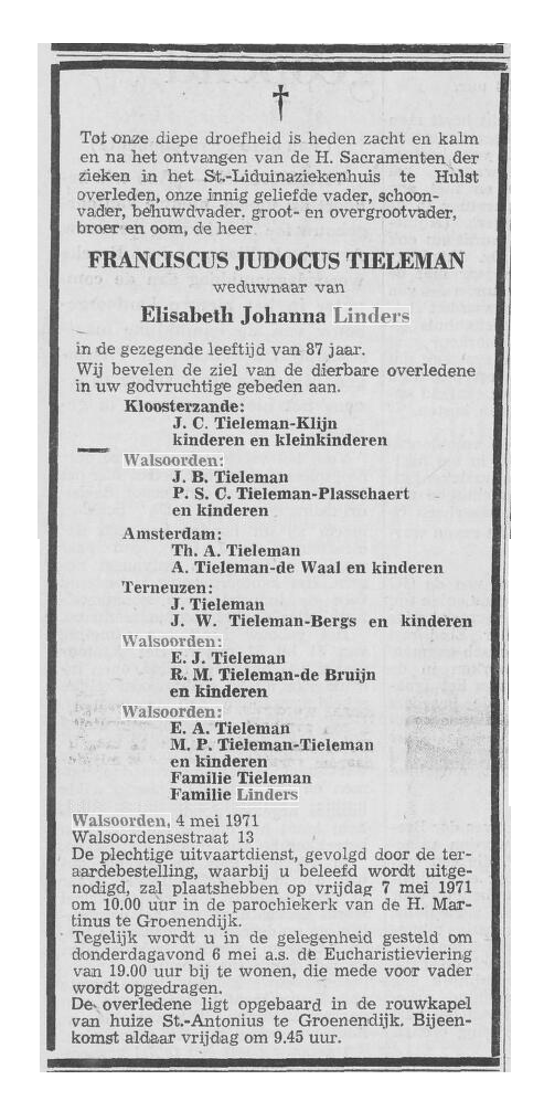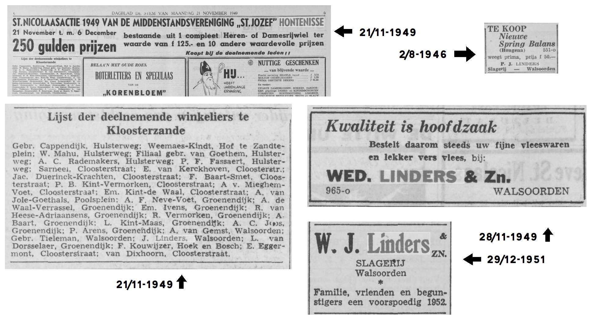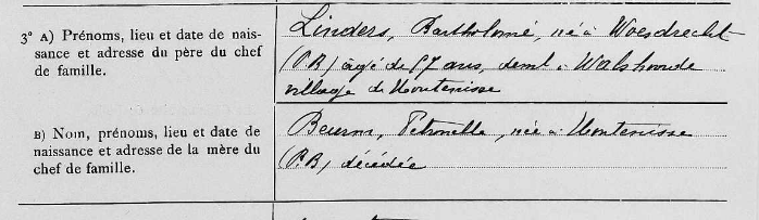 - periode 1861-1874: Woensdrecht; wijk A (dorp Woensdrecht, waarschijnlijk Nederheide), nummer 100 n.k. Het gezin bestond uit (en dan vertrekken en aankomsten daargelaten): Maria Demmers (*1788), hoofd, Adrianus Linders, hoofd, arbeider (*1816), Anna Catharina Meesters, vrouw (*1830), Elizabeth Linders, zuster (*1822), Petrus Johannes Linders, broeder (*1824), Wilhelmus Linders, zoon (*1845), Maria Johanna Linders, dochter (*1846), Petronella Linders, dochter (*1848), Bartholomeus Linders, zoon (*1852), Maria van Ostaaij, dochter (*1850), Adrianus van Ostaaij, zoon (*1853), Antonetta van Ostaaij, dochter (*1858), Johanna Linders, dochter (*1862), Maria Louisa Linders, dochter (*1863), Josephus Meesters, zwager, arbeider (*1833), Anna Catharina Linders, dochter (*1865), Johannes Baptist Linders, zoon (*1870), Elisabeth Linders, dochter (*1872) en Gerardus Josephus Meesters, zwager, polderwerker (*1833), allen werden geboren te Woensdrecht.