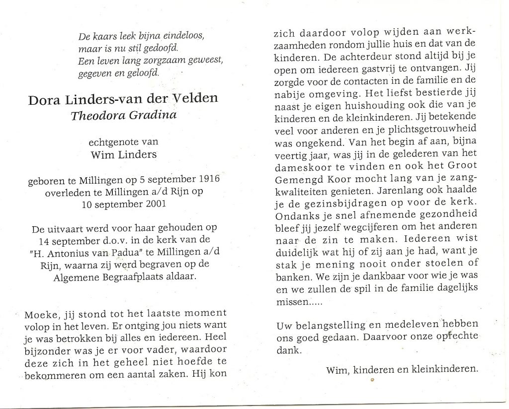 LW155. M.E.T. (Marijke) Linders. Bron 3018 schrijft: “gezin woonde aan de Heerbaan 112, het huis dat door haar opa Piet van der Velden is gebouwd.”3018 Zij trouwde met W. Hol, zoon van Kees Hol (*Tiel, Betuwe, Gelderland, 9 december 1917,3018 ✞ Nijmegen, Gelderland, 27 juni 2002,3018 begr. Millingen aan den Rijn, Gelderland, 2 juli 20023018) & Johanna Maria van Rossum (*Huissen, Overbetuwe, Gelderland, 29 mei 1917,3018 ✞ Beek, Rijk van Nijmegen, Gelderland, 28 mei 2005,3018 begr. Millingen aan den Rijn, Gelderland, 2 juni 20053018). Kees was politieagent te Millingen aan den Rijn, als opvolger van J.H.R. Wesseling.3018