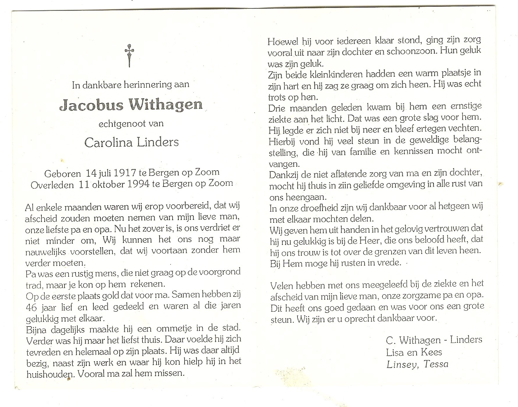 LW119. Cornelis (Cees) Linders. Geboren op 26 oktober 1920 te Hoogerheide (West-Brabant).2927,1273,80 Overleed op 18 augustus 1996 te Hoogerheide (West-Brabant).80 Geloof: rooms-katholiek. Hij was mogelijk grondwerker (periode 1920-1939).1273 Update 18/7-2018