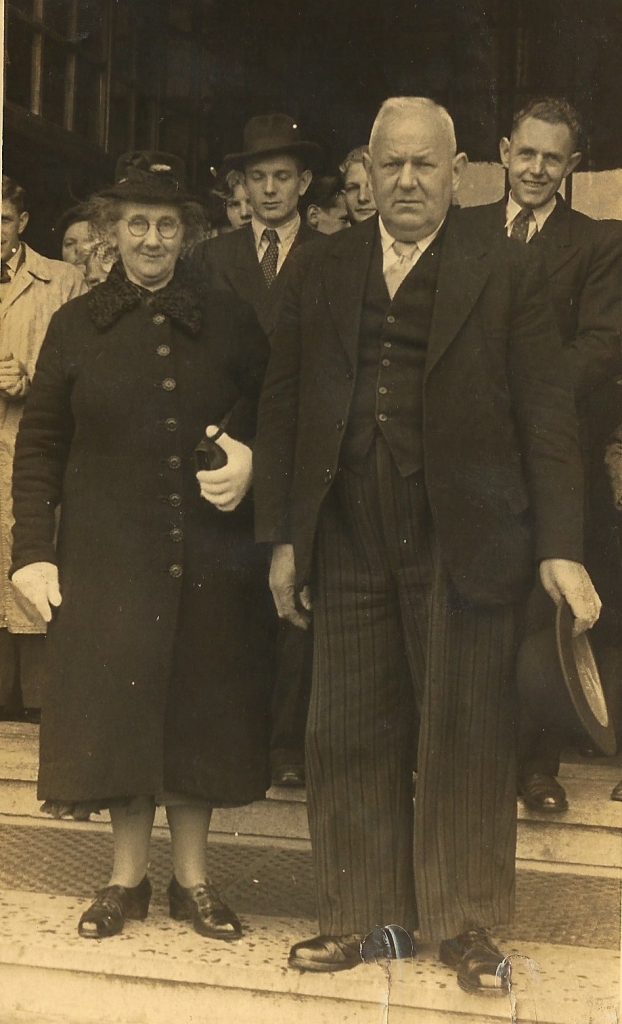 Elisabeth Bernaards-de Nijs en mijn betovergrootvader Piet Bernaards bij ’t verlaten van de Lourdeskerk, jaren ’30. Rechts achter hen mijn overgrootvader. (Afbeelding: familiefoto/hergebruik niet toegestaan)