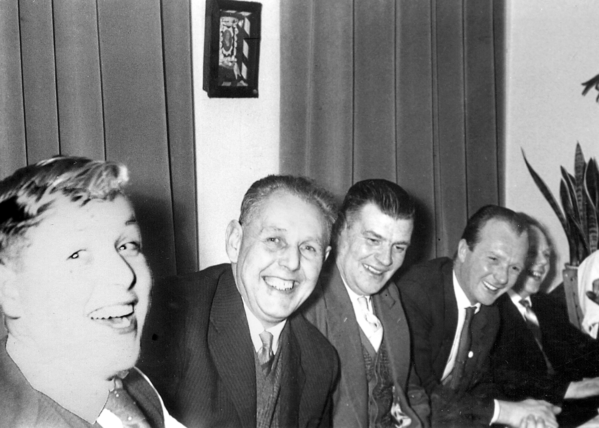Een foto gemaakt tijdens buitendijkse werkzaamheden aan de Woensdrechtse Kil, in de polders ten westen van de Brabantse Wal. v.l.n.r.: Florent Jansen, betovergrootvader Fons de Dooij, Piet Theuns, Willem Theuns en Antoon Jacobs. (Familiefoto/hergebruik niet toegestaan)