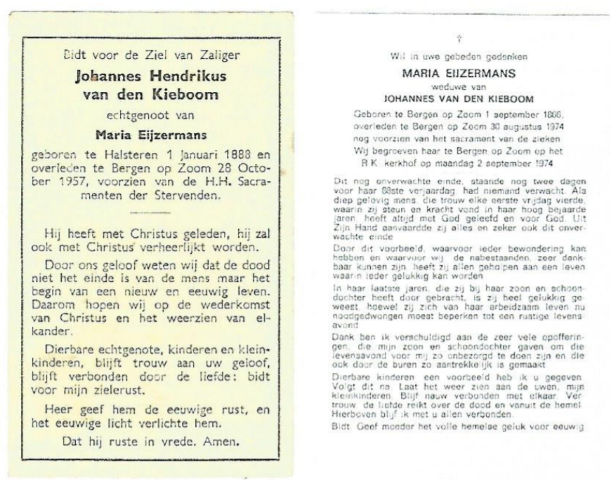 28 Johannes Hendrikus (Jan) van den Kieboom. Geboren op 1 januari 1888 (om vijf uur ’s morgens) in de gemeente Halsteren (West-Brabant), waarschijnlijk aldaar te Lepelstraat of de Oude Molen.495 Overleed op 28 oktober 1957 (om zes uur ’s avonds) te Bergen op Zoom.11 Begraven in 1957 op de R.K. Begraafplaats aan de Mastendreef te Bergen op Zoom. Geloof: rooms-katholiek. Update: 24/12-2017 Hij was polderwerker, arbeider (1905) en chef-stoker in de gasfabriek aan de Kaai in Bergen op Zoom.719,495,1473,2239 Update: 24/12-2017