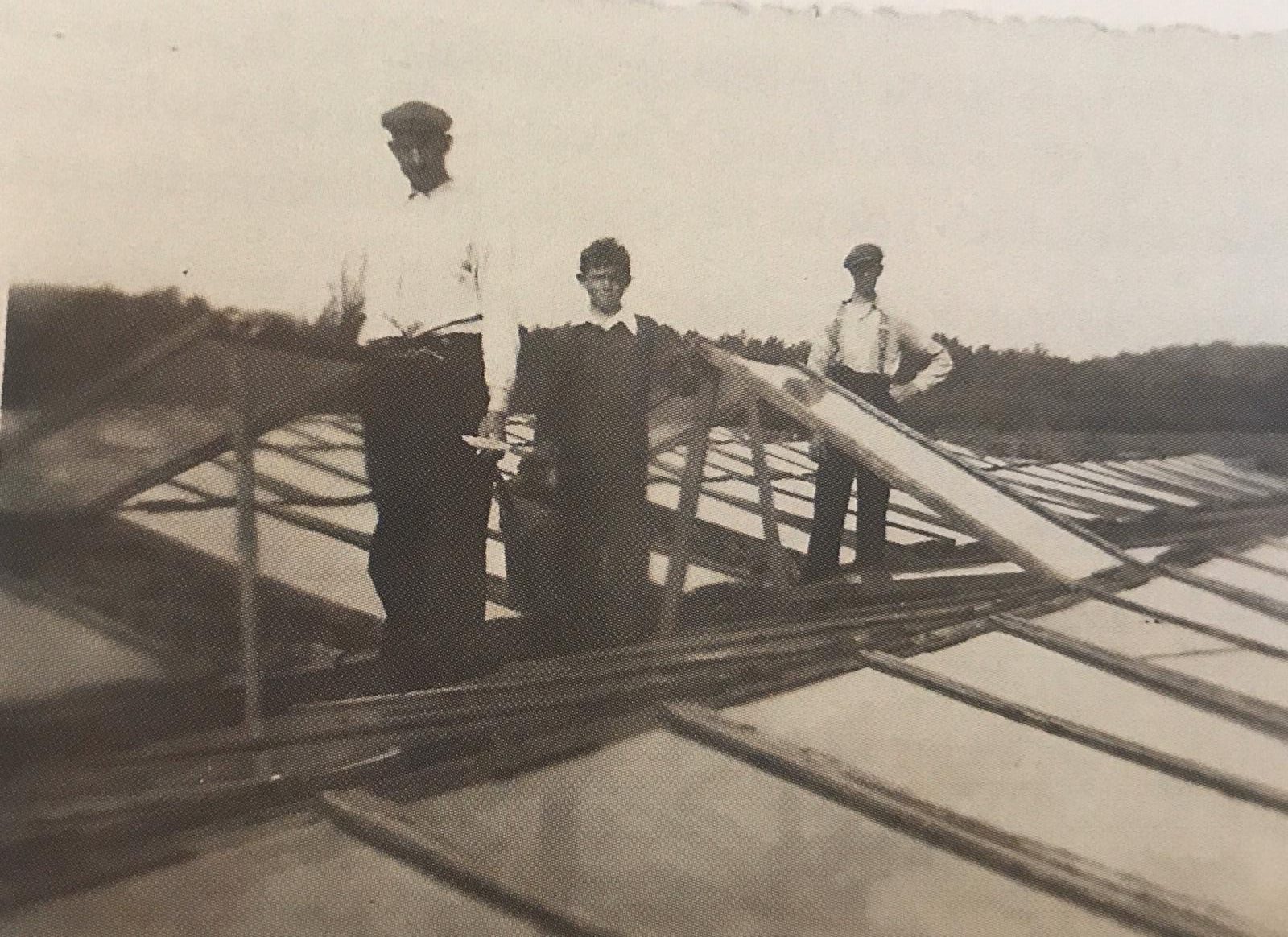 Op deze foto Nilles Nuijten met zijn zonen Harry en Piet Nuijten op ‘de Blok’ aan de Moerstraatsebaan, vóór 1940. Ze zijn bezig met oogsten van gewassen onder ‘platglas’, ramen die ze openzetten met latten. (Afbeelding: A.J.M. Nuijten) Update: 8/6-2021