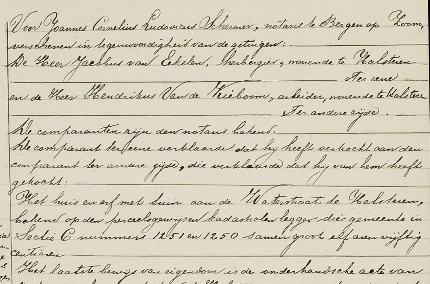 In ‘t archief vond ik een koopakte uit 1907, opgesteld bij de Bergse notaris Schermer. Mijn voorvader Hendrik van den Kieboom (*Halsteren, West-Brabant, 1857, ✞ aldaar, 1938, kwartierstaatnummer 56) was er in betrokken, samen met Jacobus van Eekelen, op dat moment herbergier te Halsteren. Hendrik kocht een huis met erf en tuin van Jacobus aan de Waterstraat te Halsteren; tussen de Sint-Martinuskerk en de Beek, óp de Brabantse Wal. Het betrof twee kavels in de Halsterse kadastersectie C, met nummer 1250 en 1251. Het geheel was elf aren en vijftig centiaren groot. Jacobus verklaarde dat het niet meer met hypotheek bezwaard was, en liet een koopakte van het pand uit 1871 uit het kantoor van hypotheken te Breda bijvoegen. Laatste zegt iets over hoe oud het huis was op dat moment. Hendrik kocht het geheel voor zeshonderd gulden, een akte betreffende een nieuwe hypotheek werd eveneens bij notaris Schermer opgesteld.