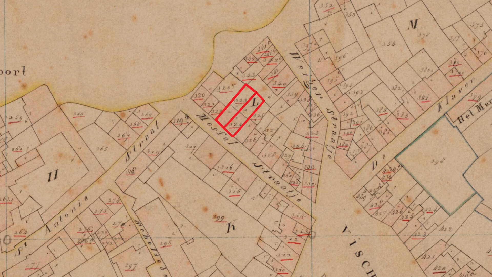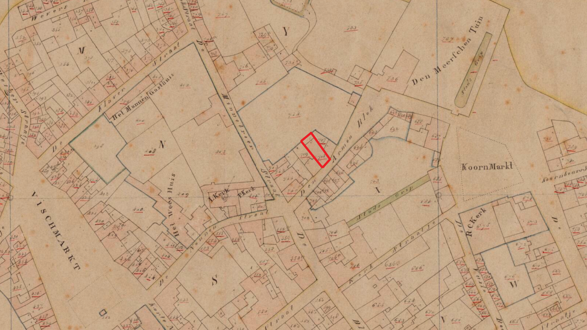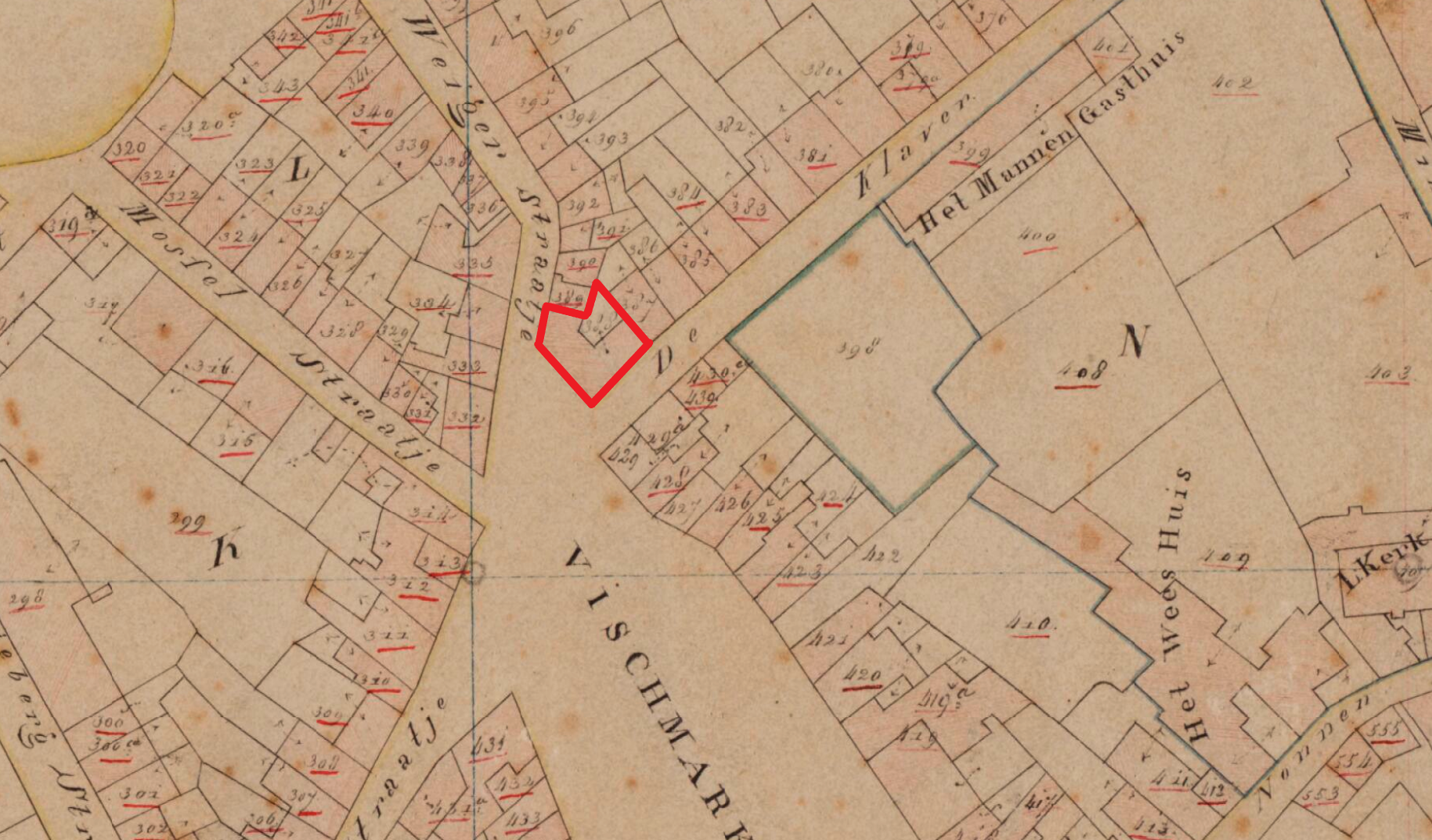 Ik ben nieuwsgierig naar de precieze locatie van het gekochte huis, vooral omdat het me nooit helemaal gelukt is om te bepalen waar in Halsteren de familie Van den Kieboom woonde. Misschien kan de vermelding van de Waterstraat achtergrond geven over waar Hendrik vóór 1907 woonde met zijn familie. Ten tijde van de geboorte van zijn zoon (mijn betovergrootvader) Johannes Hendrikus (Jan) van den Kieboom (*gemeente Halsteren, 1888, ✞ Bergen op Zoom, 1957, kwartierstaatnummer 28), woonde de familie waarschijnlijk (!) in de wijk die de Oude Molen en Lepelstraat omvatte, laatste is op zich niet ver van de Waterstraat. Hendriks schoonouders, het echtpaar Judocus Jaspers (*Halsteren, 1819, ✞ Bergen op Zoom, 1899, kwartierstaatnummer 114) x Cornelia Nuijten (*Halsteren, 1822, ✞ aldaar, 1889, kwartierstaatnummer 115), woonde in het centrum van ‘t durrep. Judocus werd geboren in het Mussengevecht. Al met al net aan de andere kant van de Waterstraat dus. Waar het gekochte huis, percelen 1250 en 1251 in kadastersectie C lagen kan ik niet terugvinden; het gaat om sectie C1 en daarvan is geen kadasterkaart uit de periode 1880-1930 beschikbaar in ‘t archief. Wel van 1832, maar de percelen zijn hernummerd, dus ook daar niets terug te vinden.