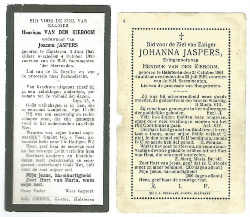 - Petrus Jacobus van den Kieboom. Geboren: Halsteren, 4/10-1893, getrouwd te Maastricht, 25/11-1914 (grondwerker) met Johanna Hageman (*Maastricht, rond 1894, dochter van Joannes Franciscus Hageman en Hubertina Scharis (glasblaaster). Overleden: Bergen op Zoom, 26/11-1943 (koopman, woonachtig te Halsteren).