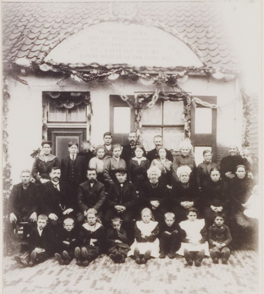 Deze foto is gemaakt in 1918, schuin tegenover de kerk van Halsteren, bij het gouden huwelijk van Jacobus van de Zande (1844-1925) en Johanna Jonkers (1840-1922). Johanna was een broer van Cornelis Jonkers; hij was echter vijf jaar eerder overleden. Misschien staat Maria van Oevelen wel op deze foto! (Bron: WBA) Update: 23/10-2023