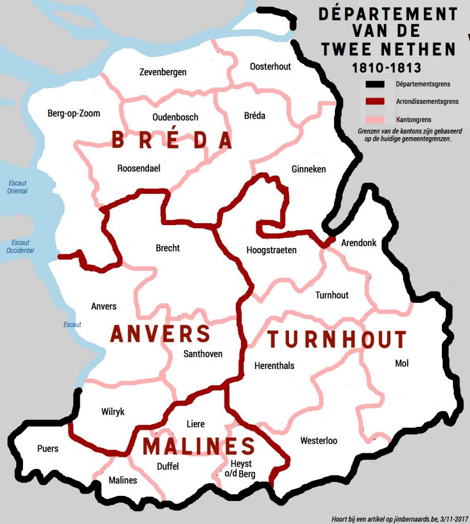 Département van de Twee Neten binnen ’t Franse keizerrijk, 1810-1813. Kaartje door mijzelf, 2017. (Update 6/11-2017: ik ben ’t kanton Ekeren vergeten. Dit kanton besloeg globaal de noordelijke helft van ’t kanton Antwerpen.