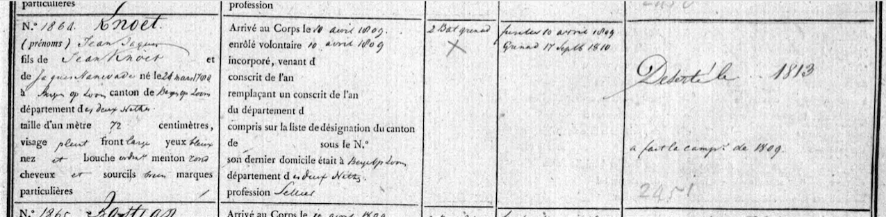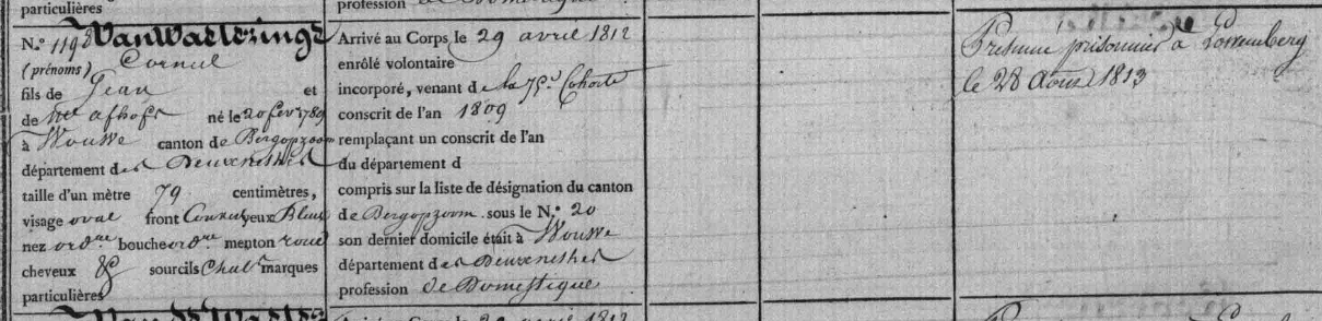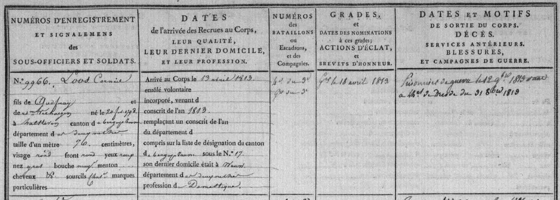 Wat opvalt is het foutieve geboortejaar wat gebruikt wordt: 1788. Nu was het, ook in 1858, niet geheel ongebruikelijk dat aangevers van een overlijden de precieze leeftijd van de overledene niet kenden, echter was Cornelis in leven toen hij in 1858 in de registers werd opgenomen. Mogelijk maakte de Franse overheid gebruik van de zeer gedetailleerde registers van de soldaten onder Napoleon, wat weer zou betekenen dat Cornelis bij zijn rekrutering in 1811 of 1812 zich ouder heeft voorgedaan dan hij werkelijk was, 23 jaar i.p.v. 18. De vraag rijst dan waarom hij dit deed. Wilde hij zó graag de Fransen steunen in hun streven naar volledige macht over Europa? Of was er de noodzaak om zijn familie financieel te ondersteunen middels zijn soldij? We zullen het nooit weten: de originele registers van het Franse leger in die tijd zijn verloren gegaan tijdens de Commune van Parijs in 1870, toen de ‘communards’ het Hôtel de Salm te Parijs, waar de registers opgeslagen lagen, in brand staken.