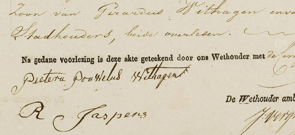 “Du quatorzième jour du mois de Mars l’an dix-huit cent quatorze à dix heures du matin. Acte de décède de Cyprien De Bère, Capitaine en service britannique, Epoux de Jeanne Elisabeth Van Hoek, décédé le Jour d’hui à une heure du matin, natif de Steenbergen âgé de cinquante deux ans, domicilié à Berg-op-Zoom, Département des Deux-Nèthes, y demeurant Section huit numero cent Cinq, fils de Daniel et de Dame Van Eck, conjoints Décédé. Sur la déclaration de Jean Alder, agé de Vingt Sept ans, particulier, demeurant Section deux numéro dix sept et de Adrien Verdult, agé de quarante un ans, particulier, demeurant, section huit numéro cent quatre comme dessus, qui ont Signé avec nous. Constaté par moi Jean Drabbe, adjoint maire délégué Officier de l’etat-civil, soussigné, duquel acte il a été donné lecture.”
