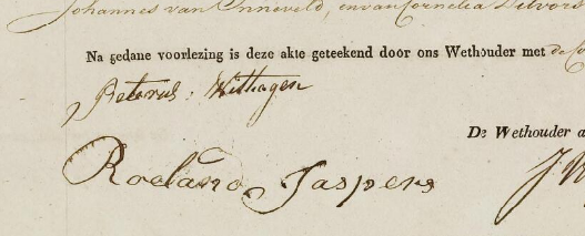 Johanna’s handtekening op een andere pagina van de huwelijksbijlagen. De ‘H’ in Johanna werd pas na de invoering van de burgelijke stand gebruikelijk, Johanna schreef haar voornaam nog zoals zij die waarschijnlijk geleerd had. (Huwelijksbijlagen Bergen op Zoom 1818)