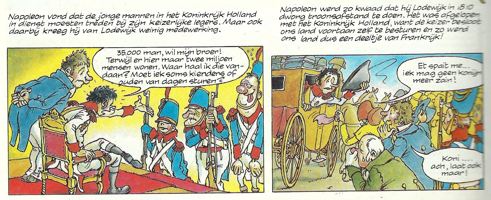 Dit is een onderzoekje wat nog lang niet af is, oftewel; er valt nog genoeg te onderzoeken. Echter ben ik eventjes met andere deelgebieden bezig. Ik presenteer u dan ook graag een kleine opsomming van voorouders en directe familie die vocht voor de Franse keizer. Waarbij ik er even vanuit ga dat u de nodige achtergronden bij dit tijdvak (Bataafse Republiek, koning Lodewijk, Waterloo, enz.) nog wel kent van school. De Fransen zaten sinds 1792 al in ’t huidige België, delen van Limburg en Zeeuws-Vlaanderen. In 1806 kwam hier mijn persoonlijke favoriet koning Lodewijk Napoleon (zie plaatje hierboven) regeren als staatshoofd van de nieuwe vazalstaat Holland. Het tot 1795 bezette Staats-Brabant ging volwaardig deel uitmaken van dit nieuwe land, nu als het département Brabant. Wat mij betreft bracht die Franse tijd hier meer goeds dan slechts; burgelijke stand (voor mij nog dagelijks handig), ’t kadaster, een grondwet, ’t metrieke stelsel, een seculiere staat.