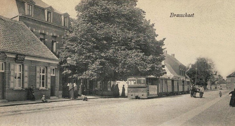 Tramlijn 64 stopt voor de kerk van Brasschaat rond 1905. Dit is de lijn waarop de Wit machinist was. (Afbeelding: M. Broos)