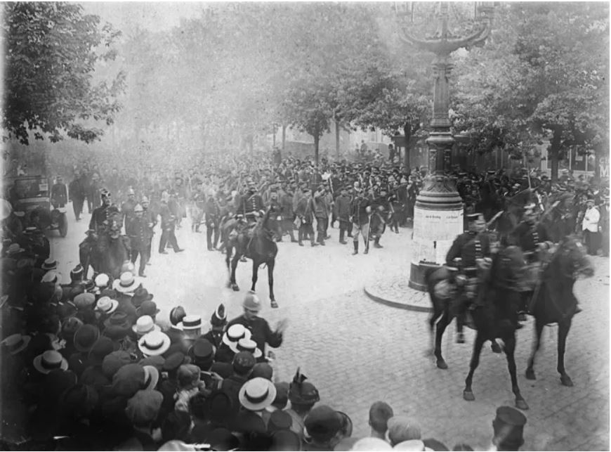 Duitse soldaten leiden een grote groep krijgsgevangen naar de Scheldekaaien in Antwerpen, september 1914. Josephus en Leentje waren twee van de velen die het te gevaarlijk vond worden en de grens over vluchtten. (Afbeelding: Het Laatste Nieuws)