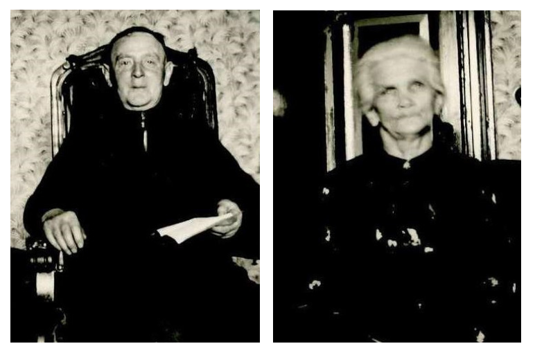 Josephus de Wit en Leentje Huismans op latere leeftijd. Misschien werd deze foto wel gemaakt in hun huis in Schoten. En ik zeg foto enkelvoud, want kijkende naar het behang rijst het vermoeden dat dit twee uitsnedes van dezelfde foto zijn, óf dat ze in één keer door dezelfde fotograaf werden genomen. (Afbeelding: Stamboom de Crom).