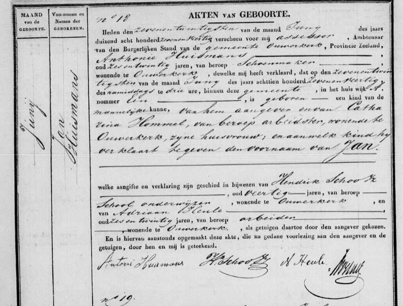 De geboorteakte van Jan Huismans, 1847. (Afbeelding: Zeeuws Archief)