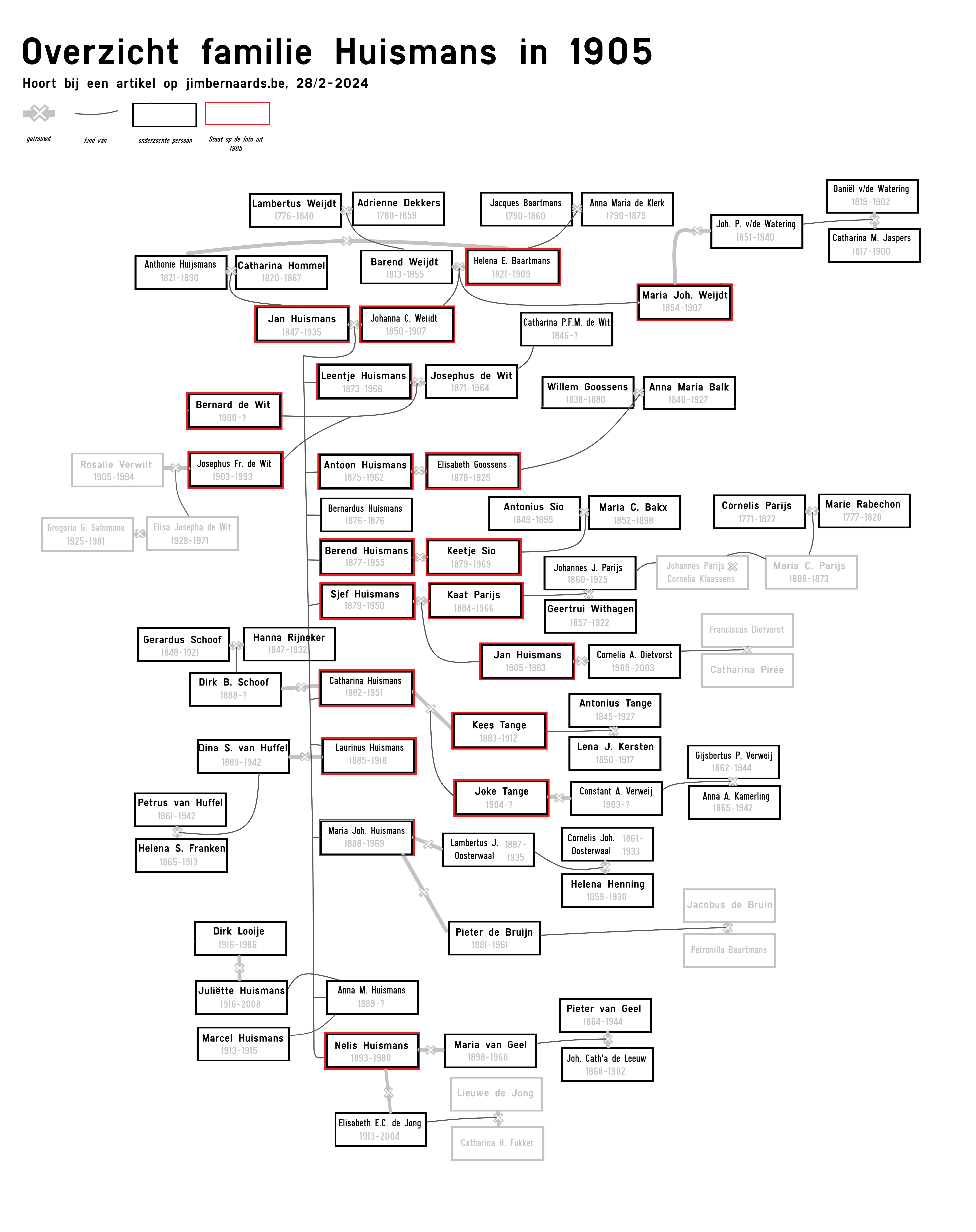 We beginnen bij Helena Isabella (Leentje) Huismans, geboren op 27 juni 1873 in de Molstraat te Bergen op Zoom, overleden op 16 maart 1966 te Schoten (Antwerpen, België), 92 jaar oud. Zij was dienstbode in 1892. Geloof: rooms-katholiek. Ook vermeld als: Hélène Isabelle – Huysman. Zij trouwde op 26 oktober 1892 met een ondertrouw op 20 oktober dat jaar te Bergen op Zoom met Josephus de Wit, geboren in de Moeregrebstraat te Bergen op Zoom op 23 januari 1871, overleden te Merksem (Antwerpen, België) op 2 augustus 1964, 93 jaar oud. Josephus staat niet op de foto uit 1905. Misschien moest hij de tram besturen! Hij was dienstplichtig militair, stoker op de stoomtram (1892), bestuurder op de interlokale tram tussen Antwerpen en Breda (1897), smid (1900), ajusteerder (1903) en bankwerker (1918). – Voor het huwelijk werd toestemming gegeven door de chef van zijn corps en zijn twee voogden: gepensioneerd militair Roelof van Beek en schoenmaker Jacobus Koolen, beiden woonachtig te Bergen op Zoom. – Getuigen bij het huwelijk waren Wilhelmus Jacobus Fukker, 31, timmerman, oom van de bruid, Cornelis Jonas, 52, kleermaker, Jacobus Weijdt, 47, negociant, oom van de bruid en Franciscus Bakx, 51, winkelier, allen woonachtig te Bergen op Zoom. – Zij kwamen op 26 oktober 1918 in uit Delft te Bergen op Zoom, waar ze werden opgenomen in het register van Belgische vluchtelingen. Dat was een paar weken voor wapenstilstand op 11 november 1918. Aan de geboorteplaatsen van de kinderen is af te leiden dat het gezin vanuit Merksem vluchtte, mogelijk naar Delft en later Bergen op Zoom, en na wapenstilstand weer terugkeerde naar Merksem. – Grootste deel van de kinderen bleef rondom Merksem en Brasschaat. Eén eindigde in Delft en één in La Louvière. – Hij werd geboren om drie uur ’s middags in de Moeregrebstraat wijk B nummer 94. De aangifte werd gedaan door Maria Cornelia Deschamps, 49, vroedvrouw, met als getuigen Gerardus Arnoldus Hubertus Kuijpers, 27 en Johannes Wilhelmus Mulkens, veertig, bedienden, woonachtig te Bergen op Zoom.