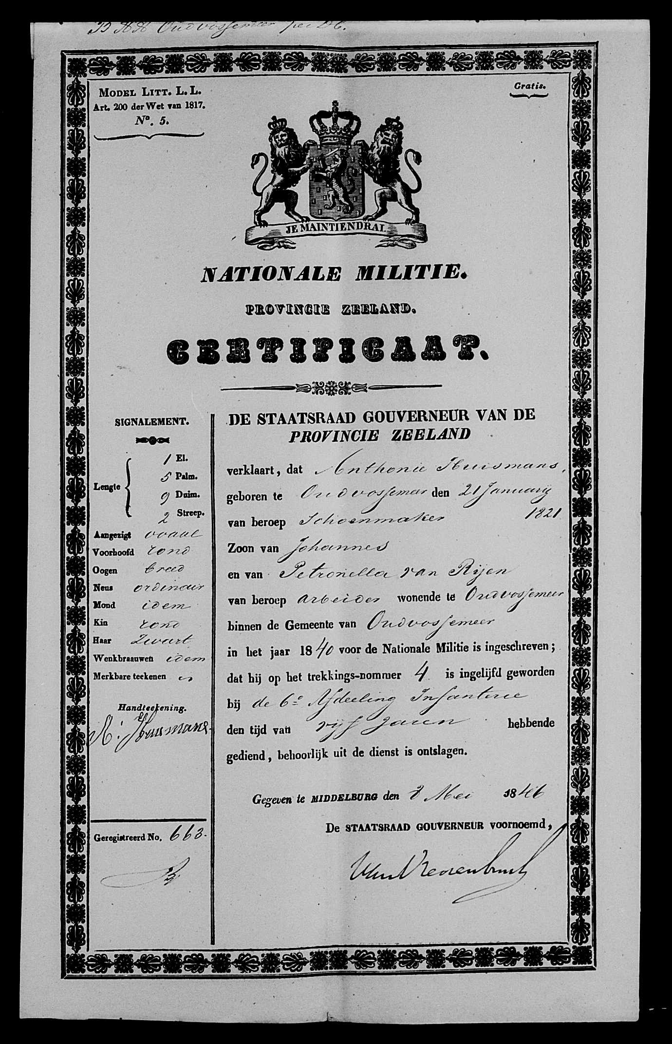 Het militiecertificaat van Anthonie uit de bijlagen van zijn huwelijksakte. Links werd zijn uiterlijk opgenomen, wat interessant is, zeker bij gebrek aan een foto. (Afbeelding: Mormoonse kerk)