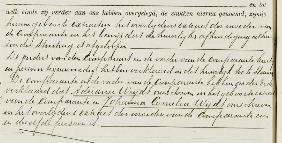 Een passage over de wisselende voornamen van moeder Huismans in de huwelijksakte van één van haar kinderen. Afbeelding: WBA.