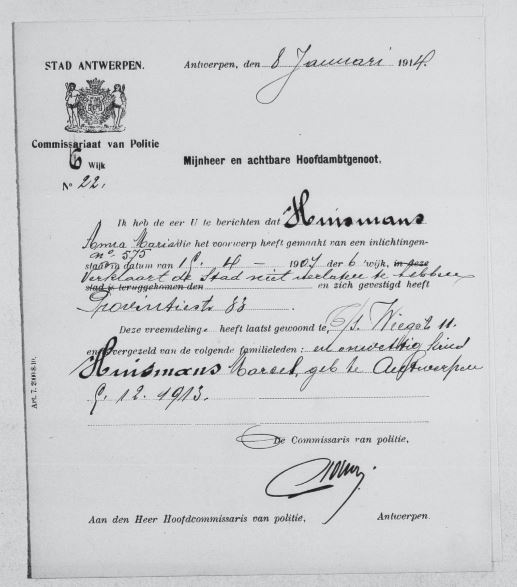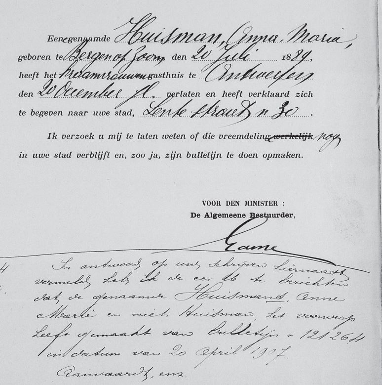 - 19/1-1916: ambtshalve ingeschreven in ouderlijk huis Bergen op Zoom, komende uit Antwerpen.