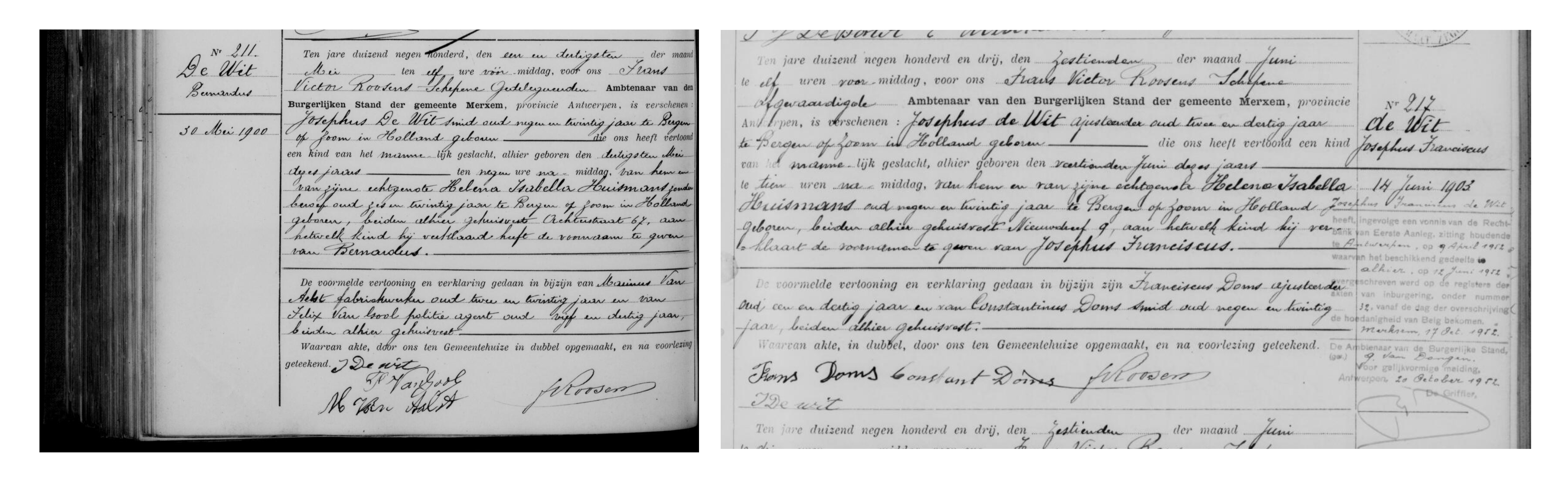De twee geboorteakten van de kinderen uit Merksem. In de kantlijn rechts staat dat J.F. de Wit op latere leeftijd genaturaliseerd werd tot belg. (Afbeelding: Mormoonse kerk)
